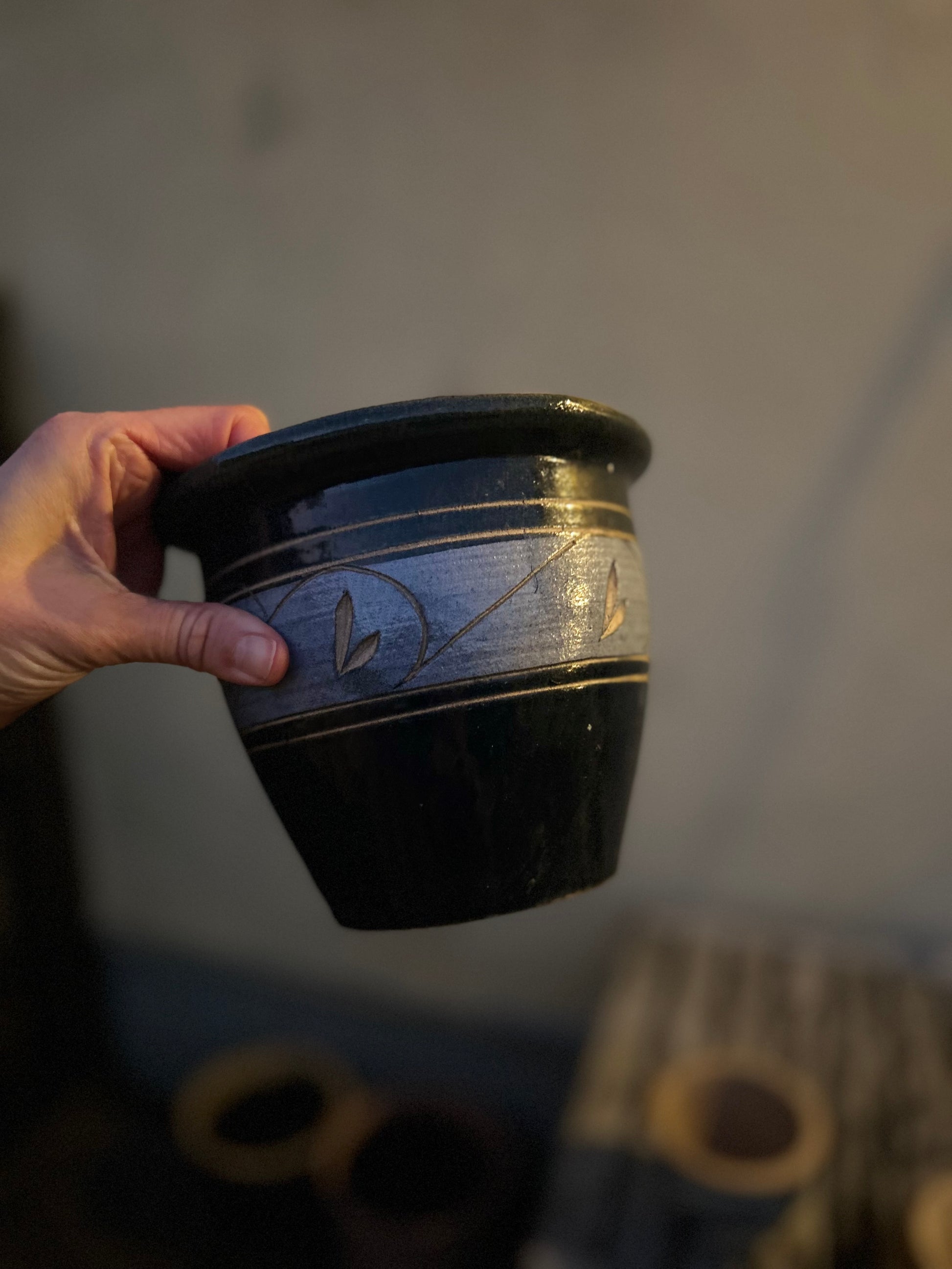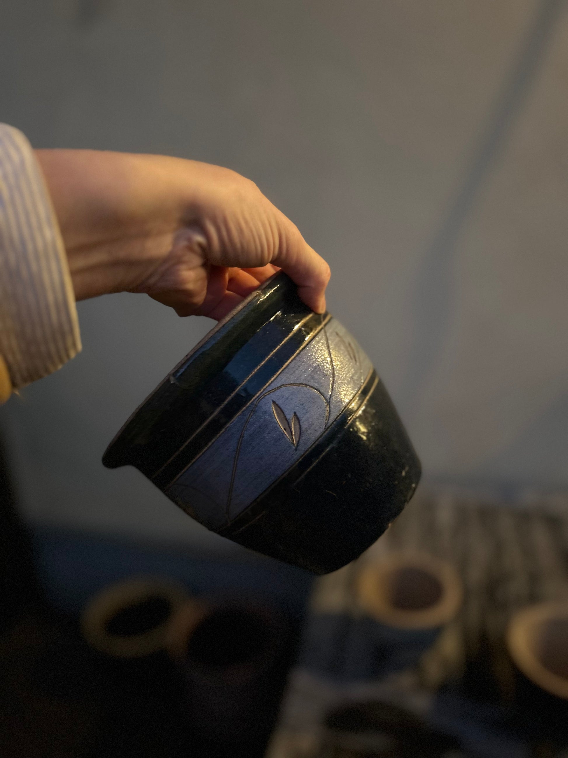 liten blå stripete krukke + 7 tulipanløk